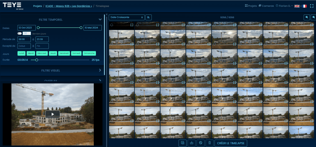 La fonctionnalité de tri des photos est au cœur de l’efficacité de TEYE. Grâce à des algorithmes avancés, la plateforme identifie et écarte les images prises lors de conditions défavorables ou pendant les périodes d’inactivité. Ce processus assure que seules les images les plus pertinentes et de la meilleure qualité sont utilisées dans les timelapses finaux. Les clients peuvent ainsi éliminer les séquences redondantes ou peu claires, ce qui est essentiel pour améliorer la qualité des présentations, des rapports, et pour optimiser la communication sur leurs réseaux sociaux.